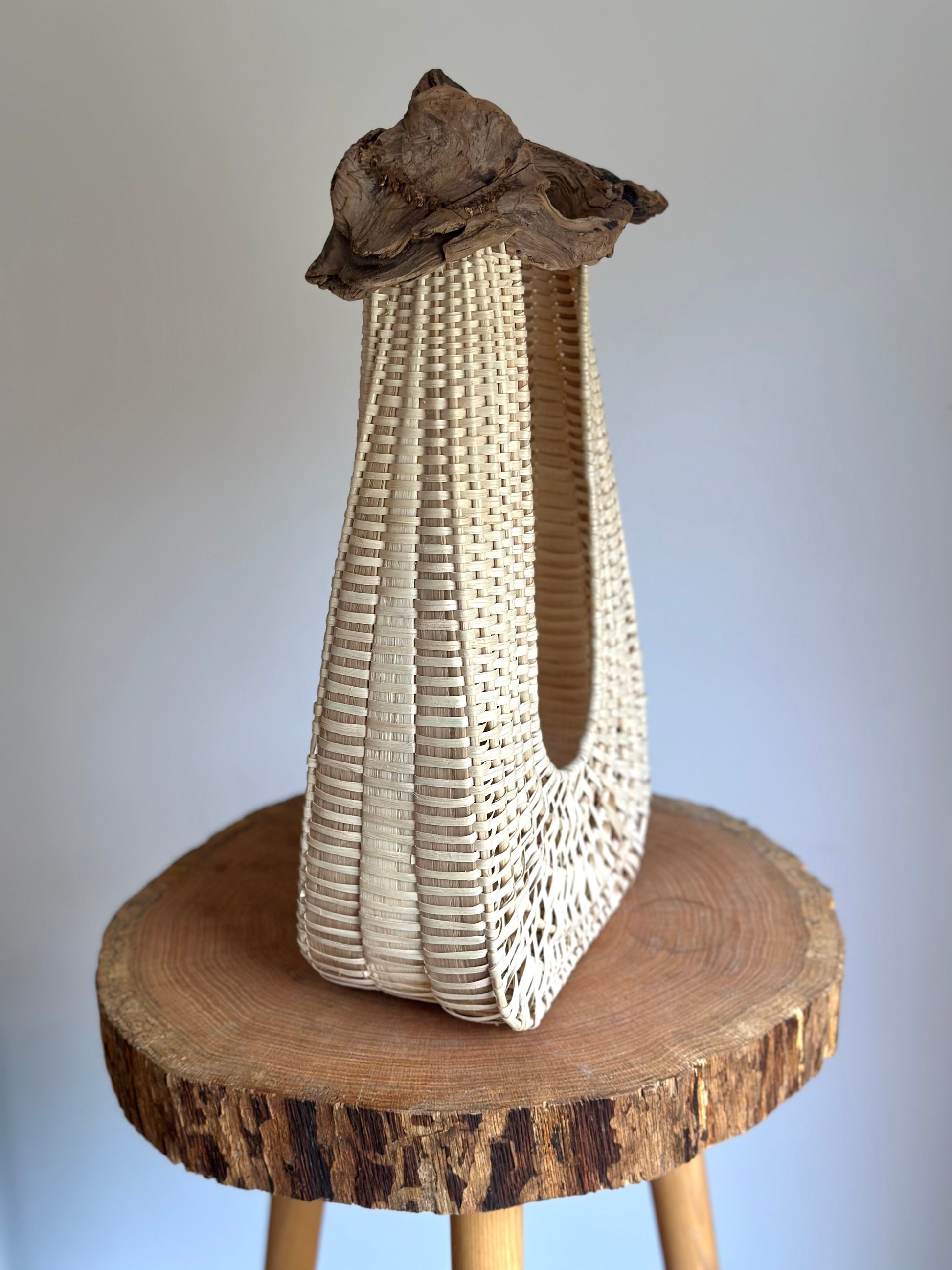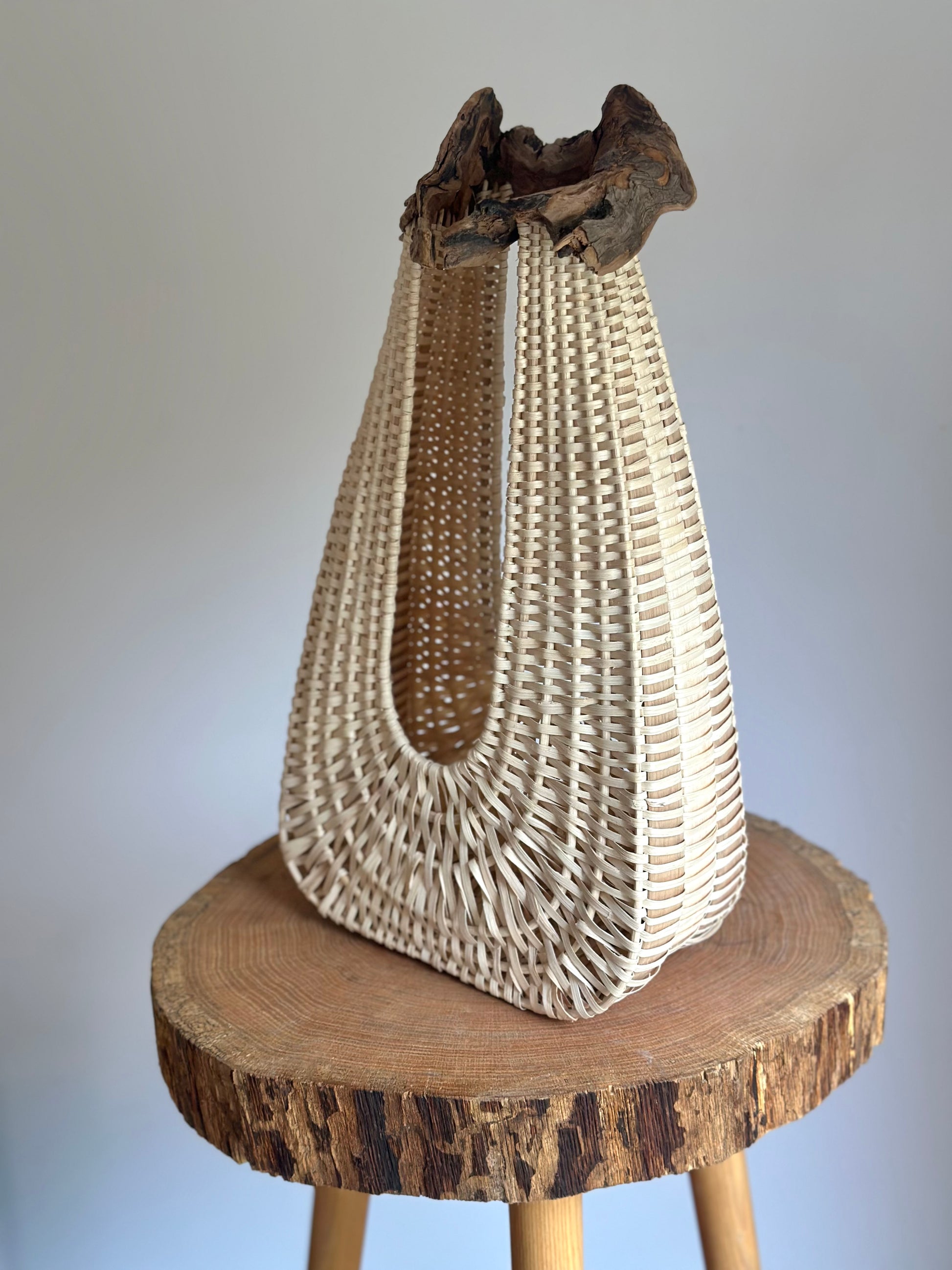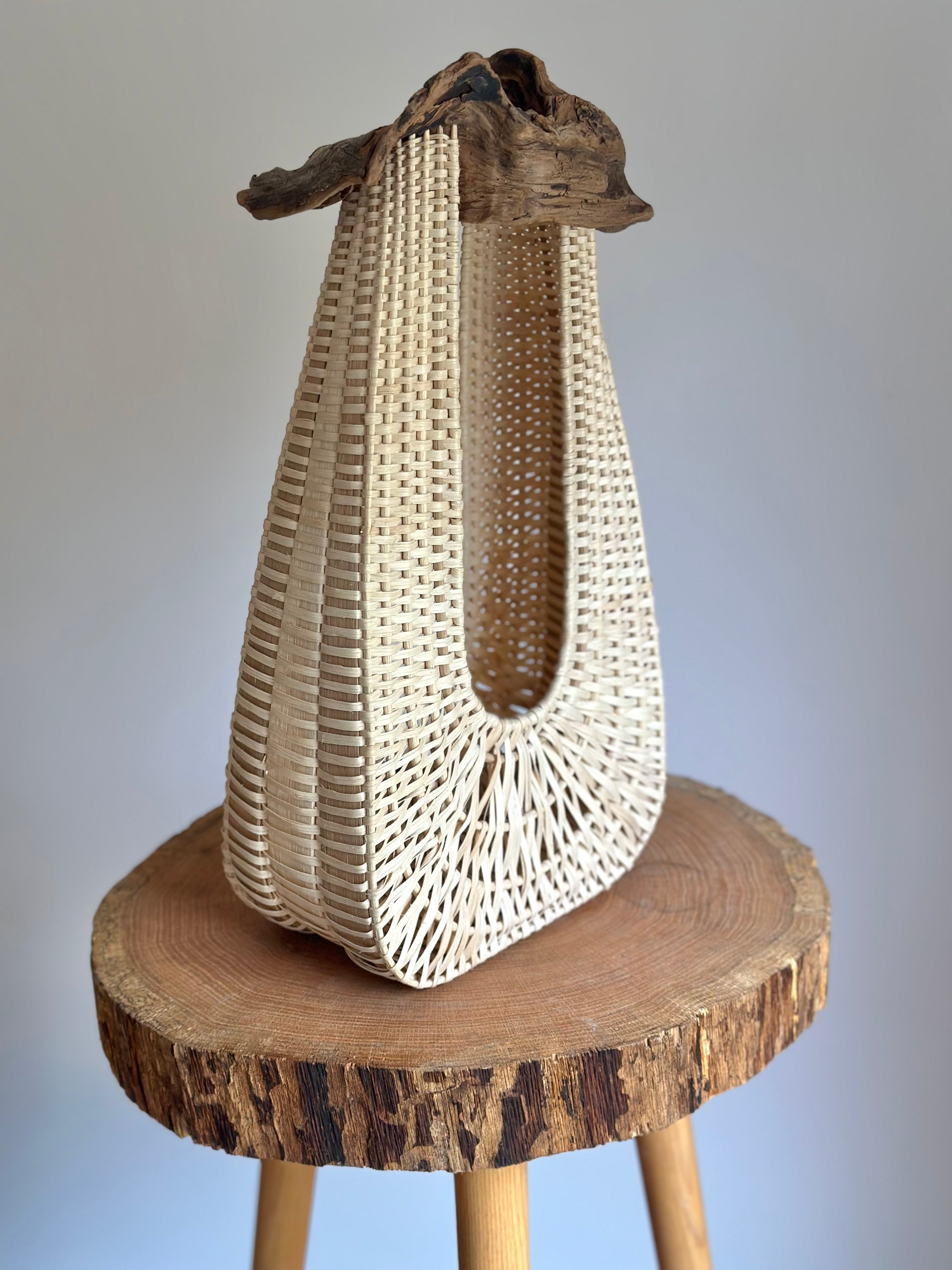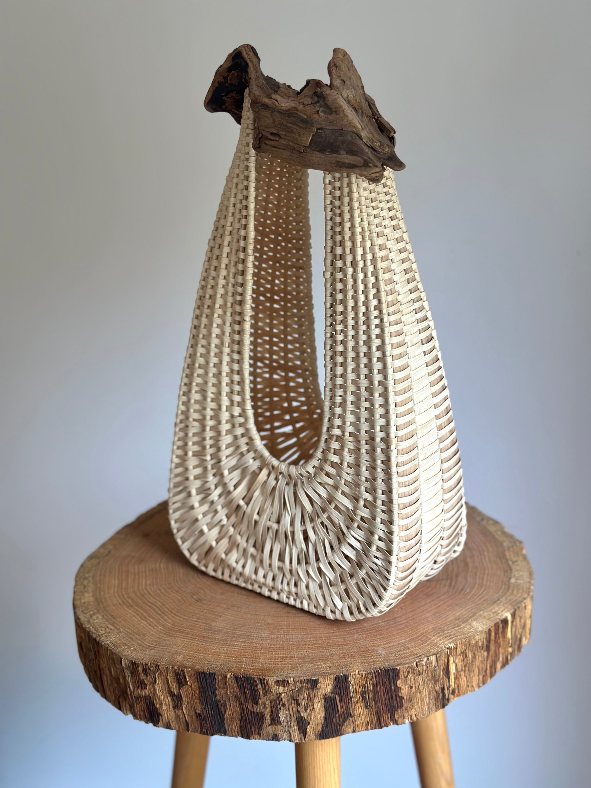 In her series titled, “Drifting,” artist Amy Krone explores the ways in which climate change has increased the frequency and severity of major flooding events throughout the world by utilizing pieces drift wood uprooted during flooding events where she lives to use as the focal point of her basketry.