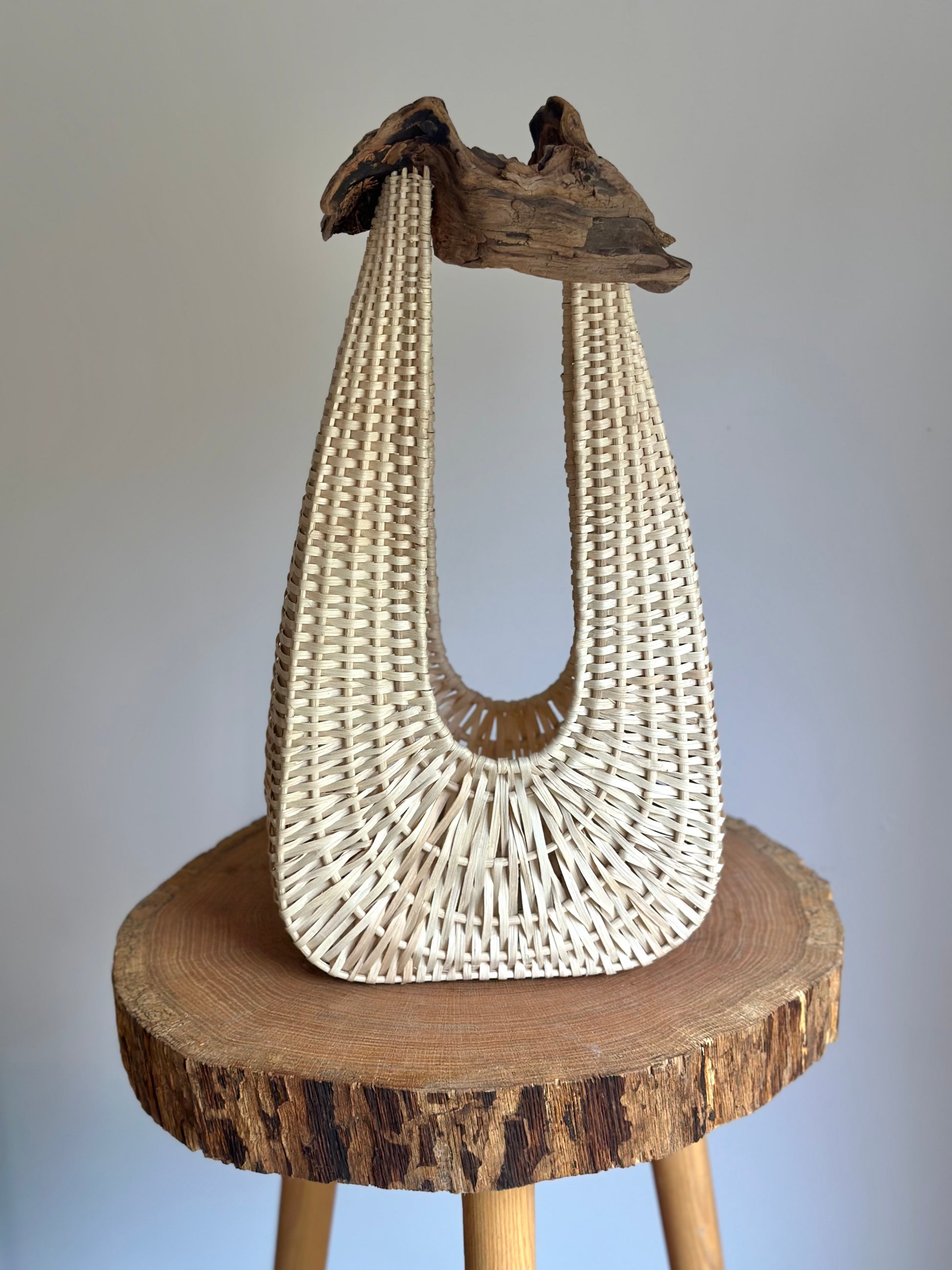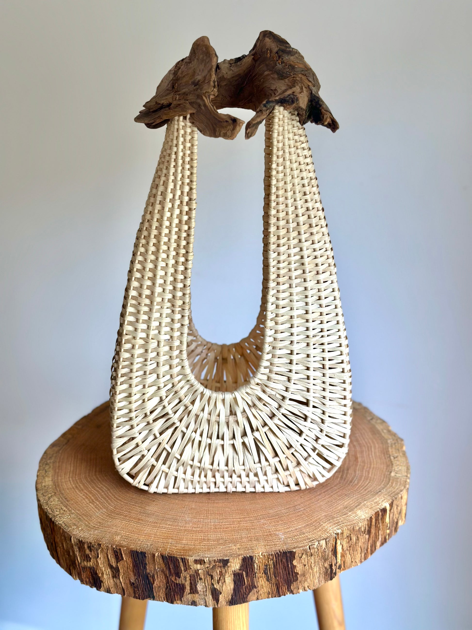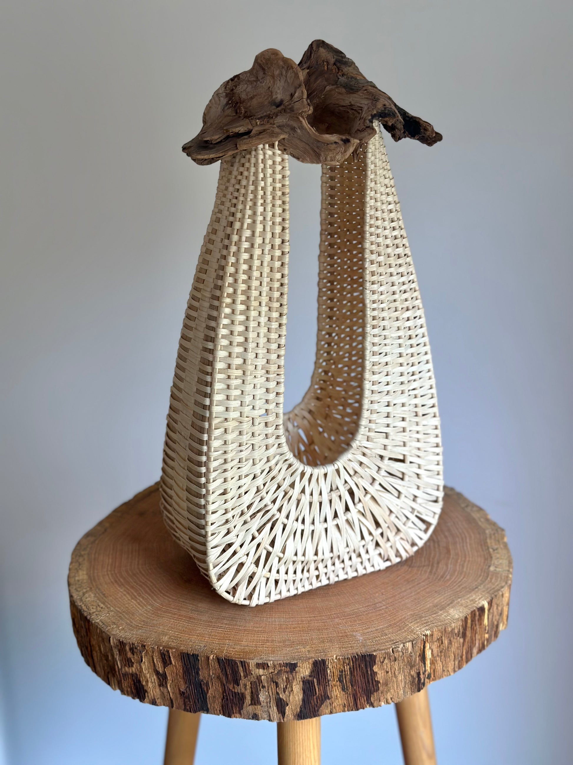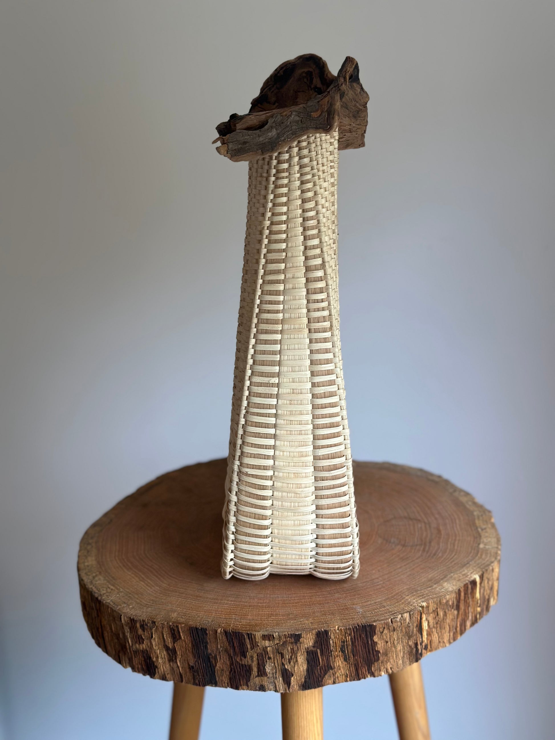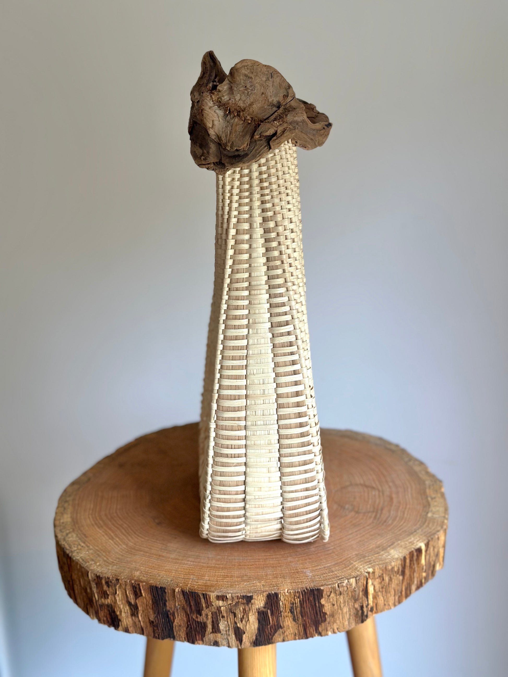 In her series titled, “Drifting,” artist Amy Krone explores the ways in which climate change has increased the frequency and severity of major flooding events throughout the world by utilizing pieces drift wood uprooted during flooding events where she lives to use as the focal point of her basketry.